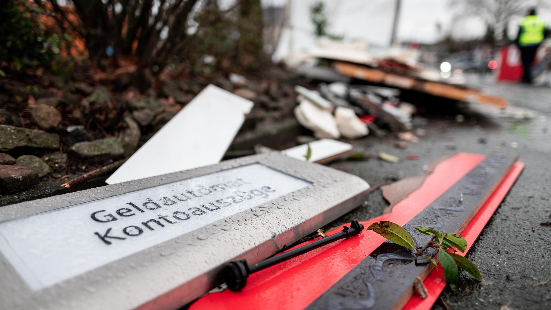 Bild: Das Schild eines gesprengten Geldautomaten liegt zwischen Trümmerteilen auf dem Boden