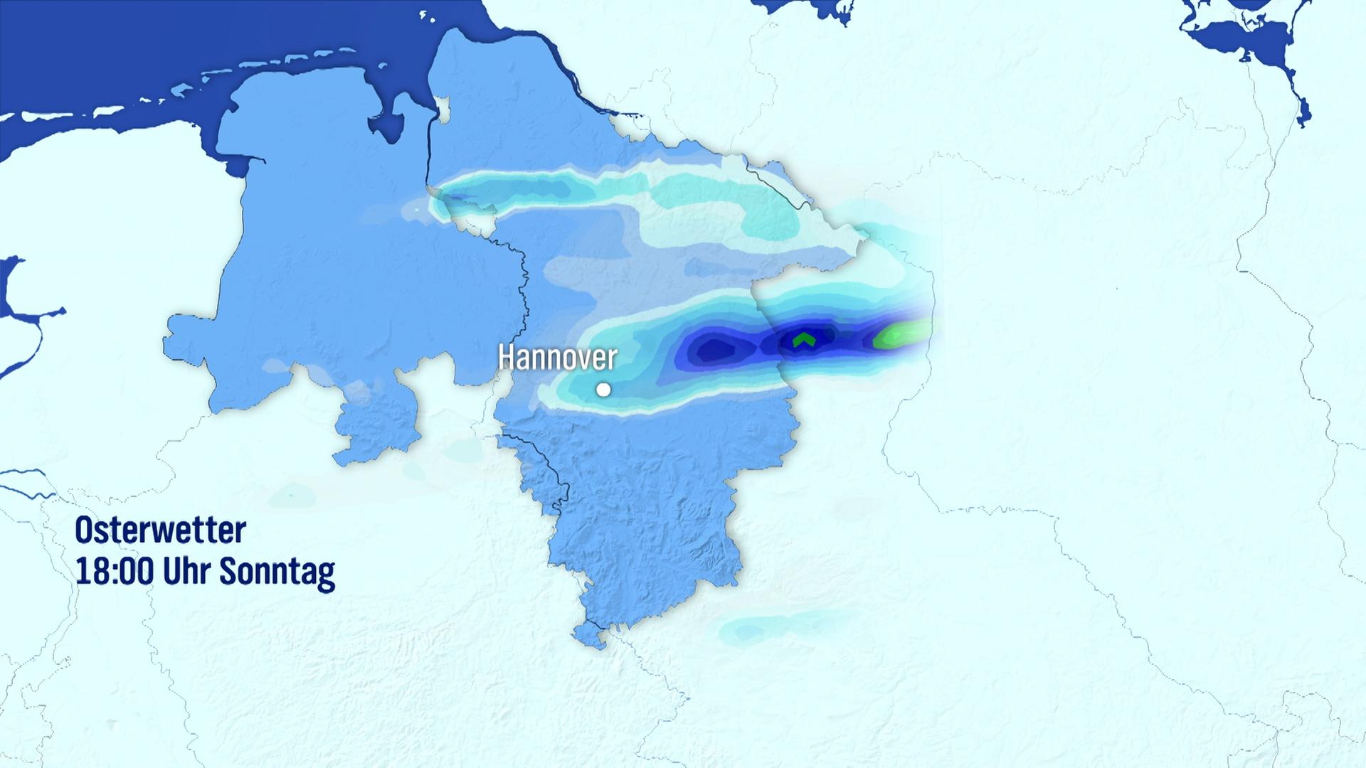 Bild: Ein Screenshot einer Animation der Niederschlagsvorhersage für Niedersachsen über die Osterfeiertage.