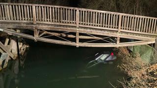 Bild: Ein Auto ist in ein Staubecken der Innerste gestürzt. Es ragt unter einer Brücke aus dem Wasser.