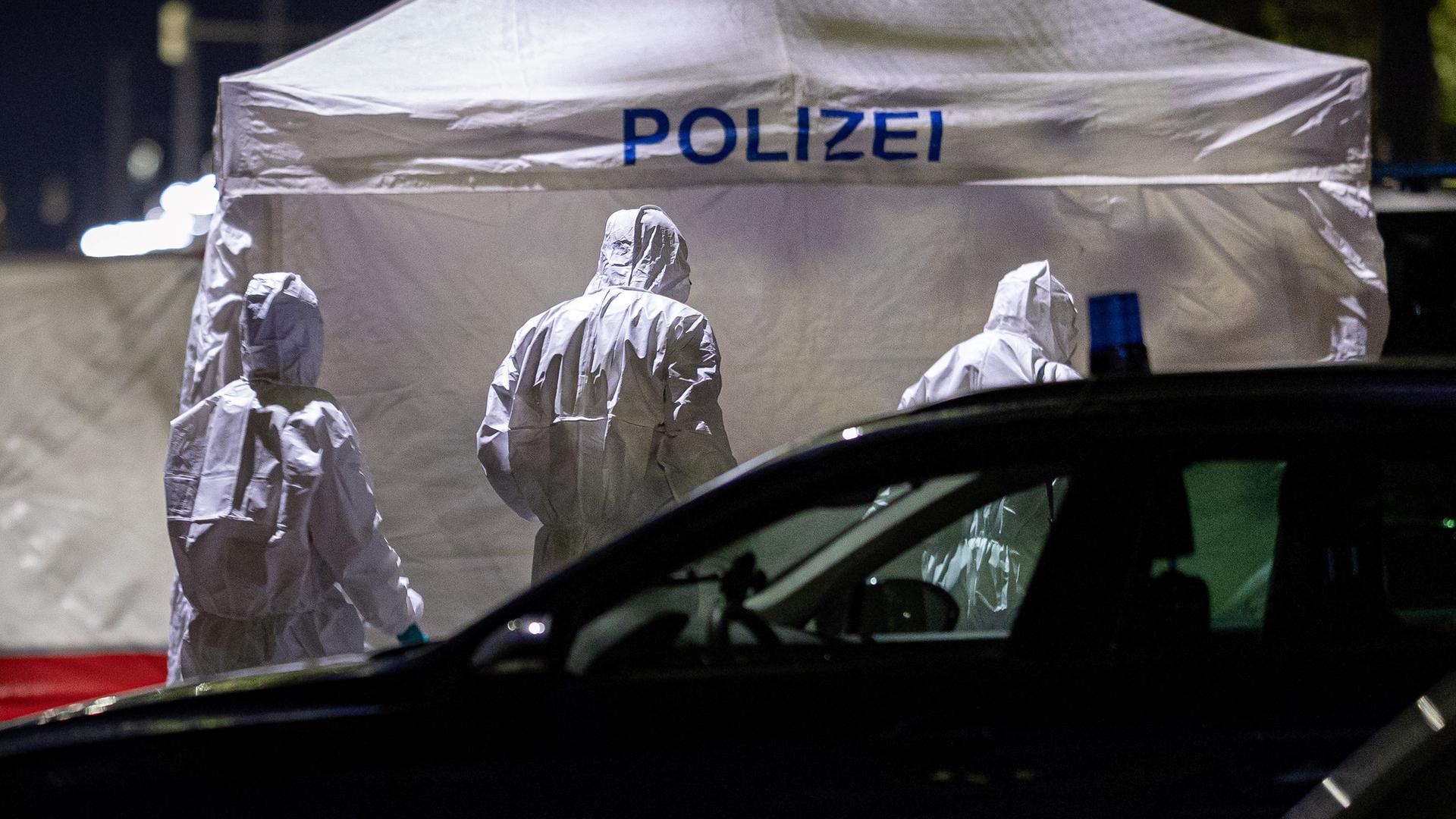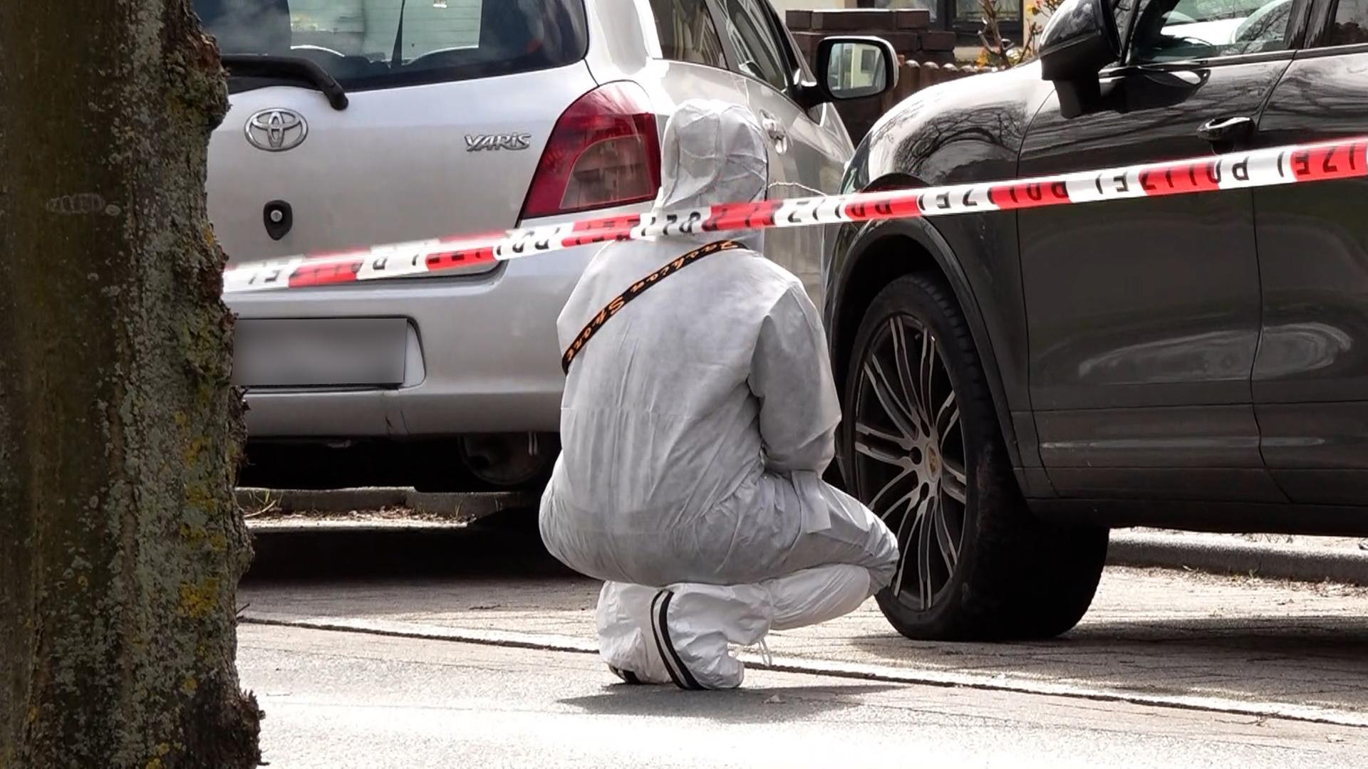 Bild: Eine Polizeibeamtin sucht nach Spuren, nachdem in Bremen ein 60-Jähriger angeschossen wurde.
