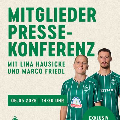 Wer schon immer einmal selbst Teil einer Pressekonferenz sein wollte, bekommt jetzt die Chance dazu: Bei der zweiten exklusiven Mitglieder-PK stellen sich Kapitänin Lina Hausicke und Kapitän Marco Friedl den Fragen der Werder-Mitglieder – direkt im PK-Raum des Weserstadions.