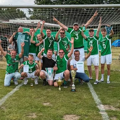 Bild: Werder-Fans jubeln bei der Fanclub-Meisterschaft auf einem Gruppenfoto. Sie stehen auf einem Rasenplatz im Tor, vor ihnen stehen zwei Pokale.