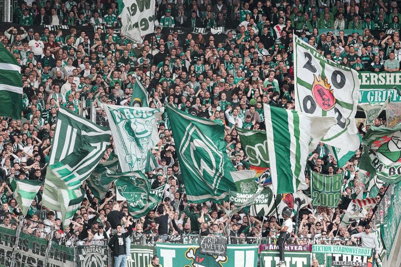 Bild: Der Auswärtsblock der Werder-Fans in Stuttgart, in dem viele Werder Bremen-Fahnen geschwungen werden