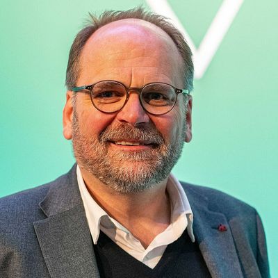 Bild: Lächelnder Mann mit Brille und Bart, bekleidet mit Anzug und Pullover, steht vor einem grünen Hintergrund.