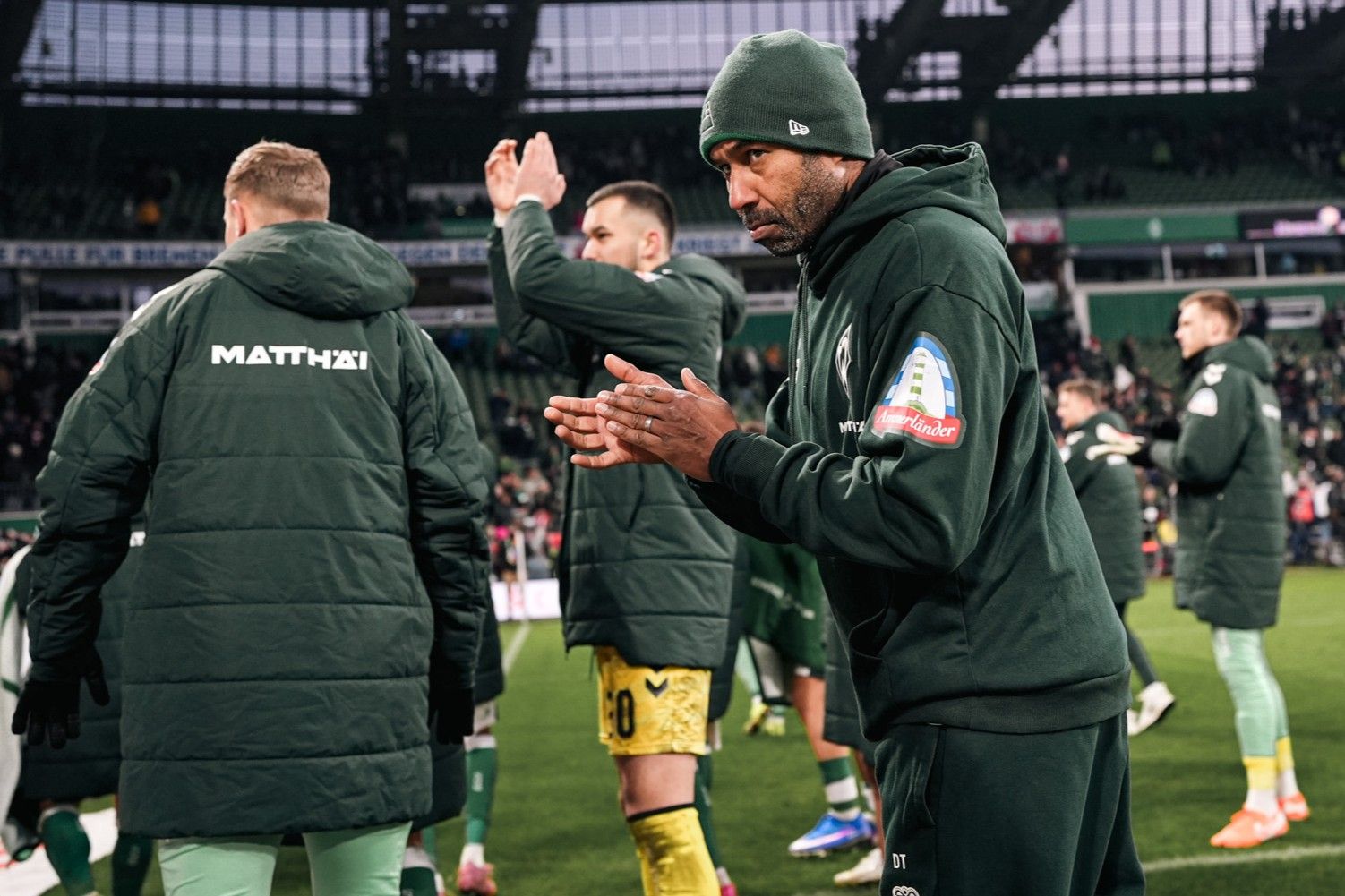 Bild: Daniel Thioune klatscht in Richtung der Fans, er trägt einen Werder-Pullover und eine Mütze.