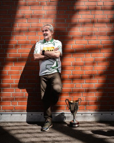 Bild: Ein Mann in einem weißen Sporttrikot lehnt mit verschränkten Armen an einer Backsteinmauer, neben ihm auf dem Boden steht eine silberne Trophäe.