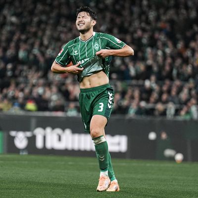 Bild: Nahaufnahme von Yukinari Sugawara. Er trägt ein Werder-Trikot.
