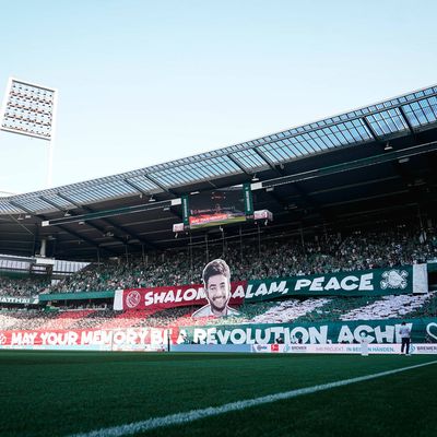 Bild: Ein Stadion voller Fans, die ein großes Banner mit dem Gesicht eines Mannes und den Worten „Shalom, Salam, Peace“ und „May Your Memory Be a Revolution, Ach!“ hochhalten.