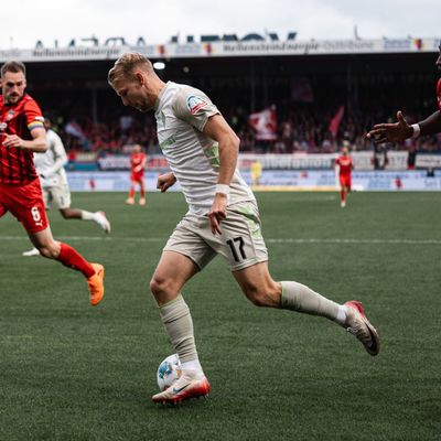 Bild: Nael Afriyie behauptet den Ball im Spiel gegen den VfL Wolfsburg gegen einen grätschenden Gegenspieler.