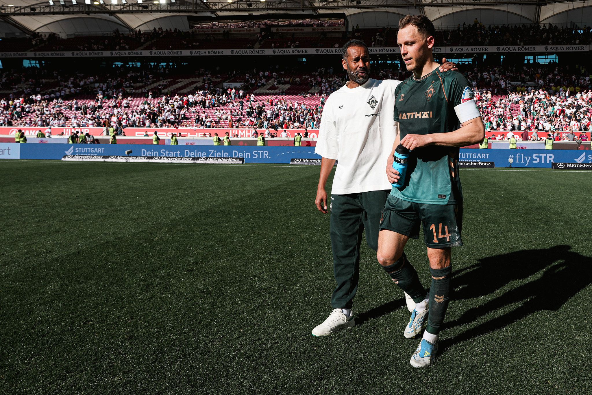 Bild: Zwei Fußballspieler verlassen das Spielfeld, einer in Spielkleidung mit einer blauen Flasche in der Hand, der andere in einem weißen Hemd. Im Hintergrund ist das Stadionpublikum zu sehen.