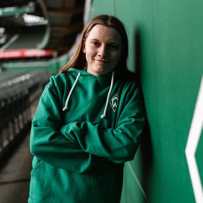 Bild: Sarah Ernst in Großaufnahme. Sie lehnt an der Ostkurvenwand und trägt einen grünen Werder-Hoodie.