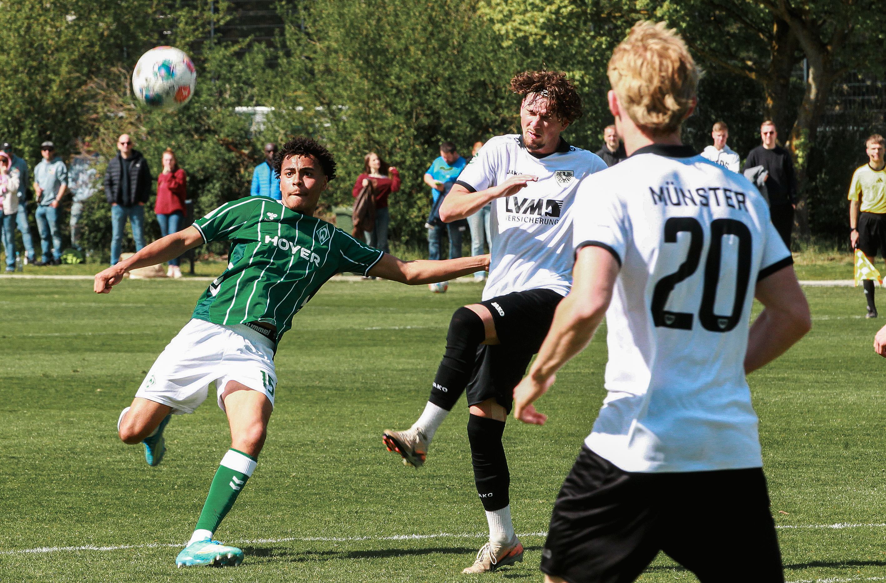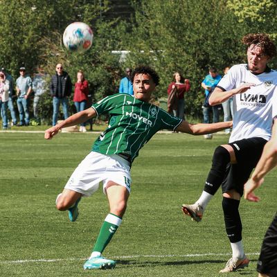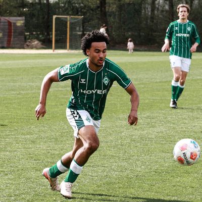 Bild: Ein Spieler der Werder-U19 im grün-weißen Dress läuft mit dem hochspringendem Ball in Richtung der rechten Bildhälfte
