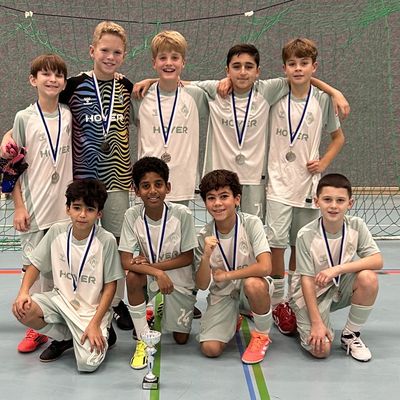 Bild: Neun Jungen einer Hallenfußballmannschaft in hellgrünen Trikots mit Medaillen, Torwart in buntem Trikot, posieren vor einem Tor um einen Pokal herum.