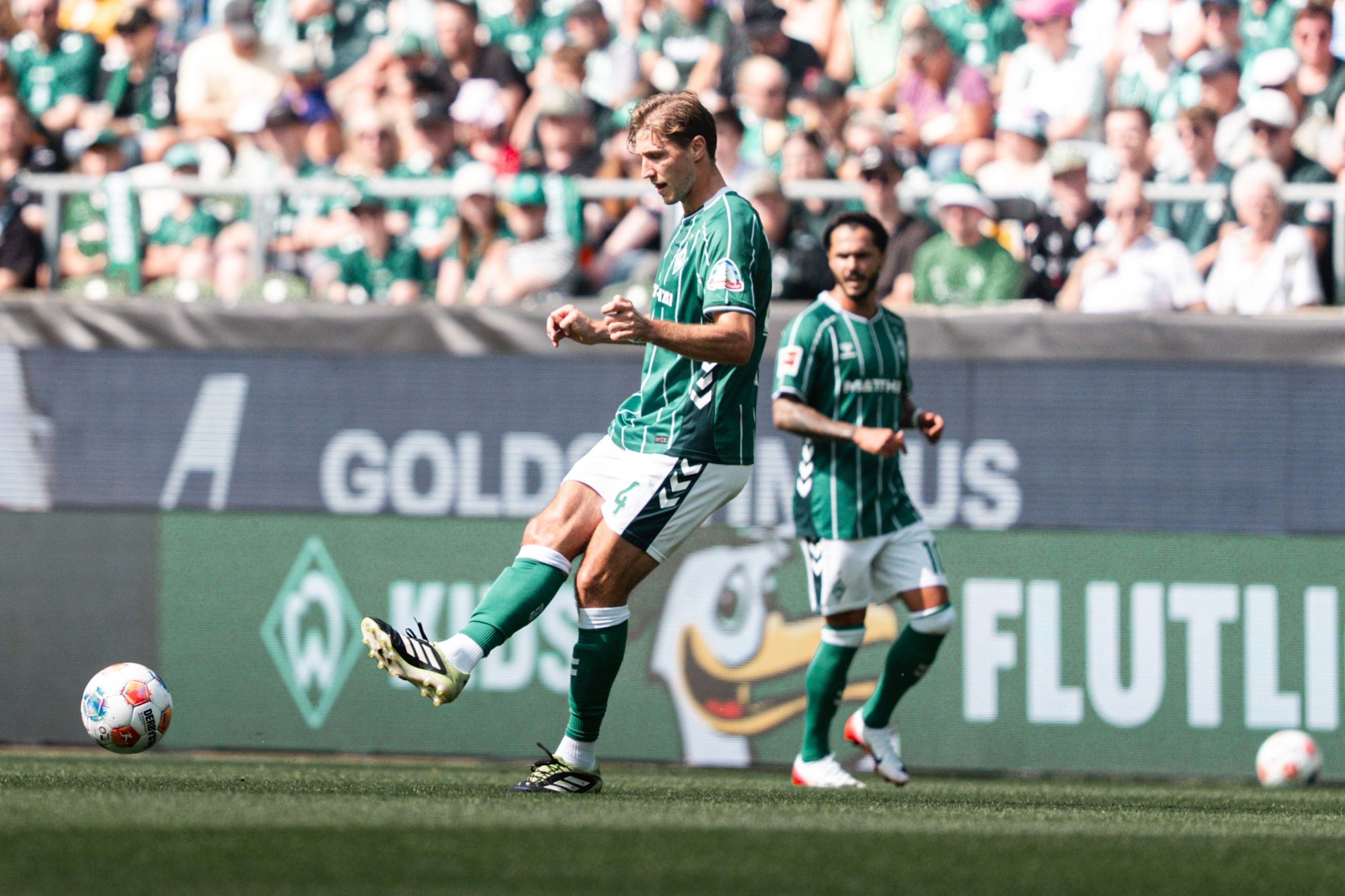 Bild: Niklas Stark spielt einen Pass im Werder-Trikot.