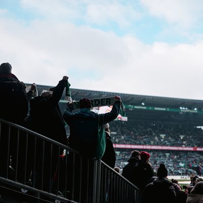 Bild: Fans jubeln im Weserstadion, mit Blick auf das Spielfeld und einer großen Menschenmenge unter bewölktem Himmel.