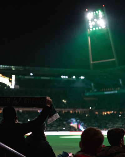 Bild: Fans halten einen Werder-Bremen-Schal in einem schwach beleuchteten Stadion bei Nacht, während helle Flutlichter das Spielfeld erhellen.