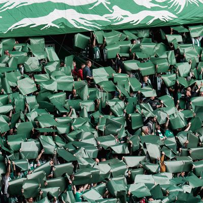 Bild: Die Fußballmannschaft versammelt sich auf dem Spielfeld, während auf den Tribünen des Stadions, das voller jubelnder Fans ist, ein großes, farbenfrohes Oktopus-Transparent weht.