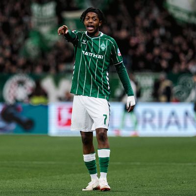 Bild: Samuel Mbangula im Werder-Trikot auf dem Platz.