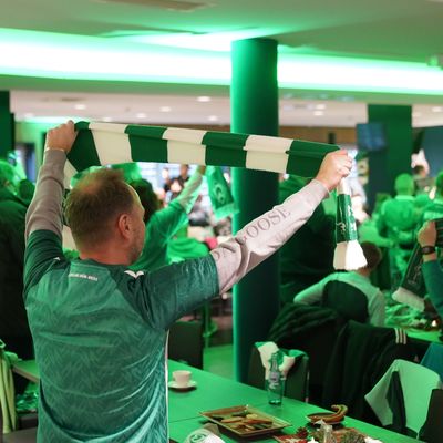 Bild: Ein Werder-Fan zeigt den Schaal in die grün beleuchtete Location. Viele andere Fans tun es ihm nach.