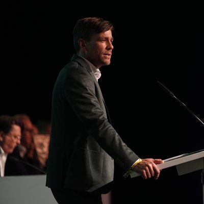 Bild: Jens Stage sitzt auf der Bühne im PK-Raum vorm Mikro und lächelt.