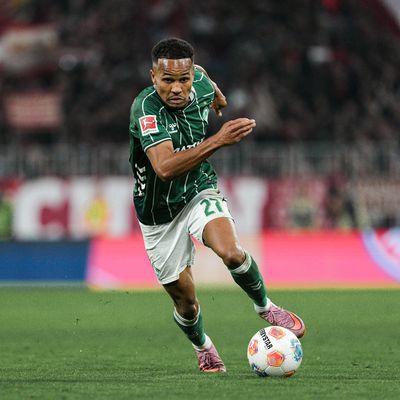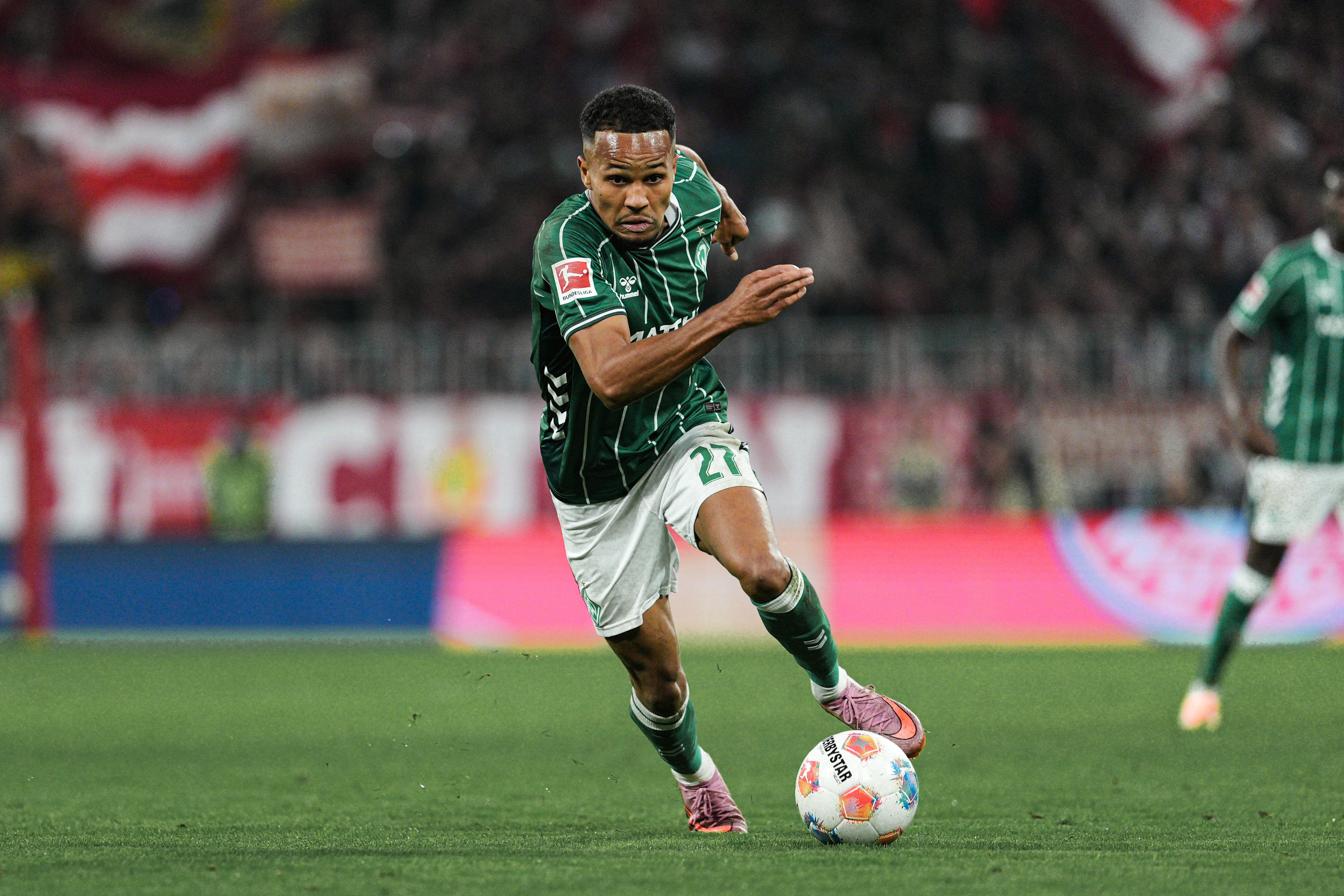 Bild: Felix Agu mit Ball am Fuß im Werder-Trikot beim Hinspiel in München.