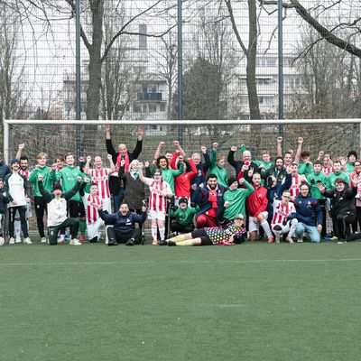 Bild: Eine Gruppe von Menschen steht in einem Fußball-Tor. Sie jubeln.
