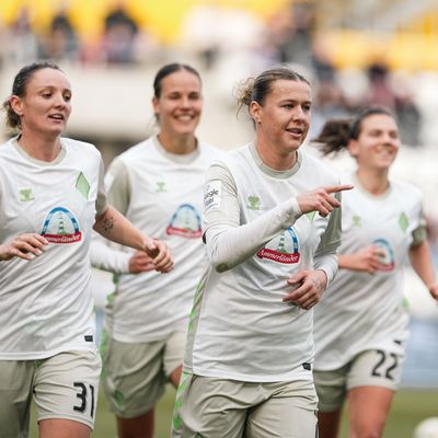 Bild: Die Werderfrauen stehen Arm in Arm, lächelnd in weißen Trikots und grünen Jacken an der Seitenlinie eines Stadions mit blauen und gelben Sitzen.