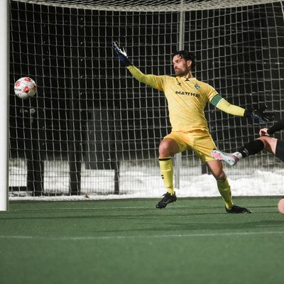 Bild: Ole Springer versucht einen Ball zu parieren, der auf ihn zufliegt, während zwei Spieler vor ihm stehen.