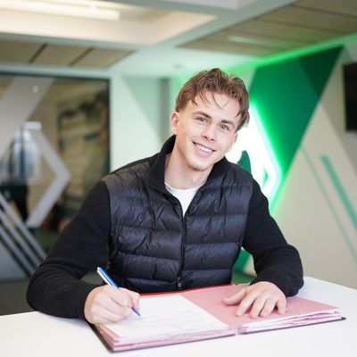Bild: Noah Birkenpesch unterschreibt seinen Vertrag vor einer Werder-Raute.