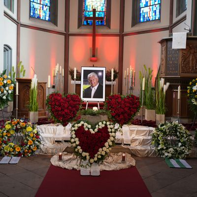 Bild: Ein Portraitbild von Max Lorenz und Blumen sind in einer Kirche aufgestellt.