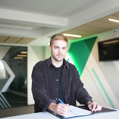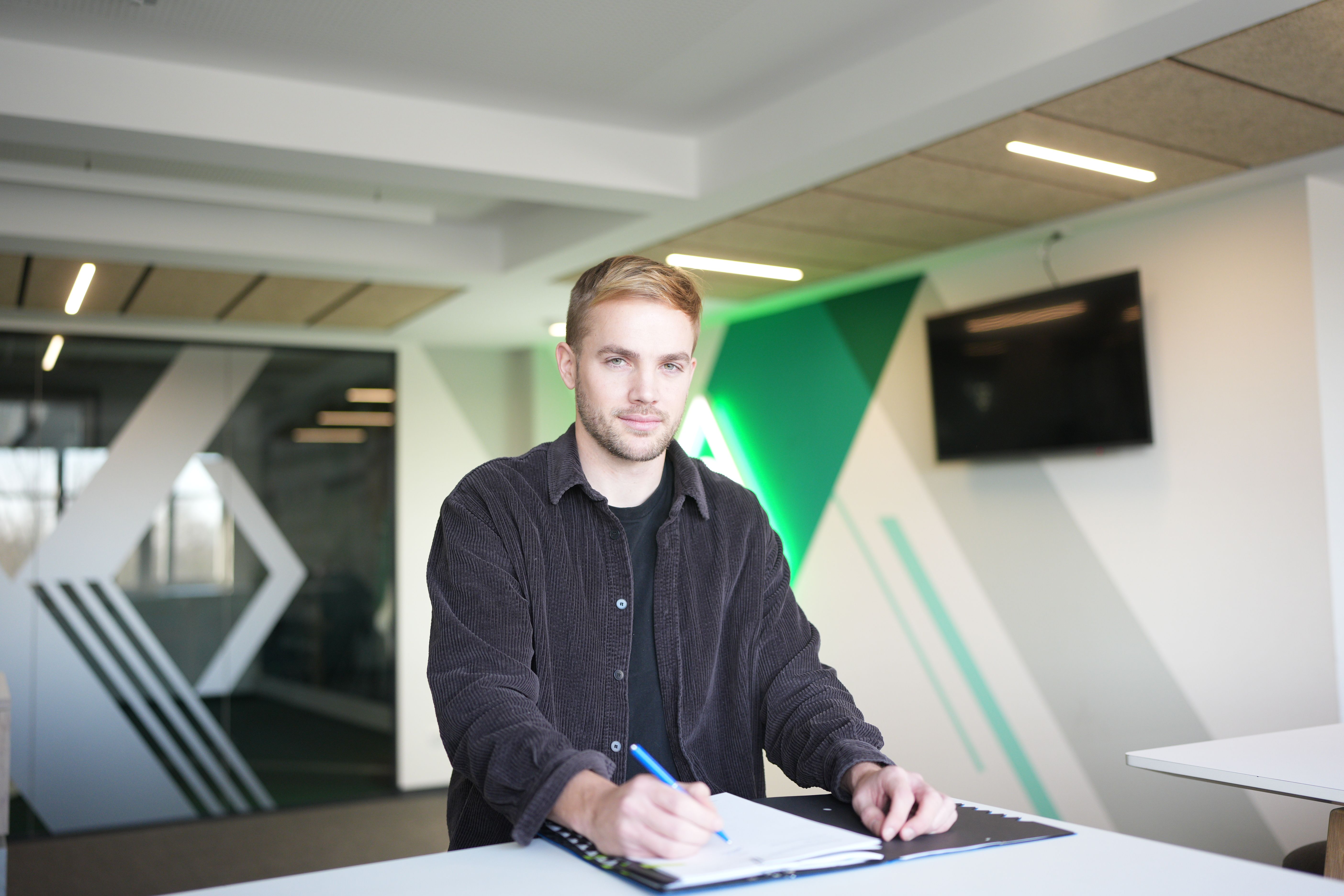 Bild: Yasin Chebil, ein junger Mann, sitzt an einem Tisch und unterschreibt einen Vertrag.