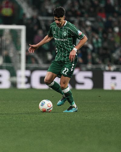 Bild: Julian Malatini mit Ball am Fuß im grünen Werder-Heimtrikot im Weserstadion