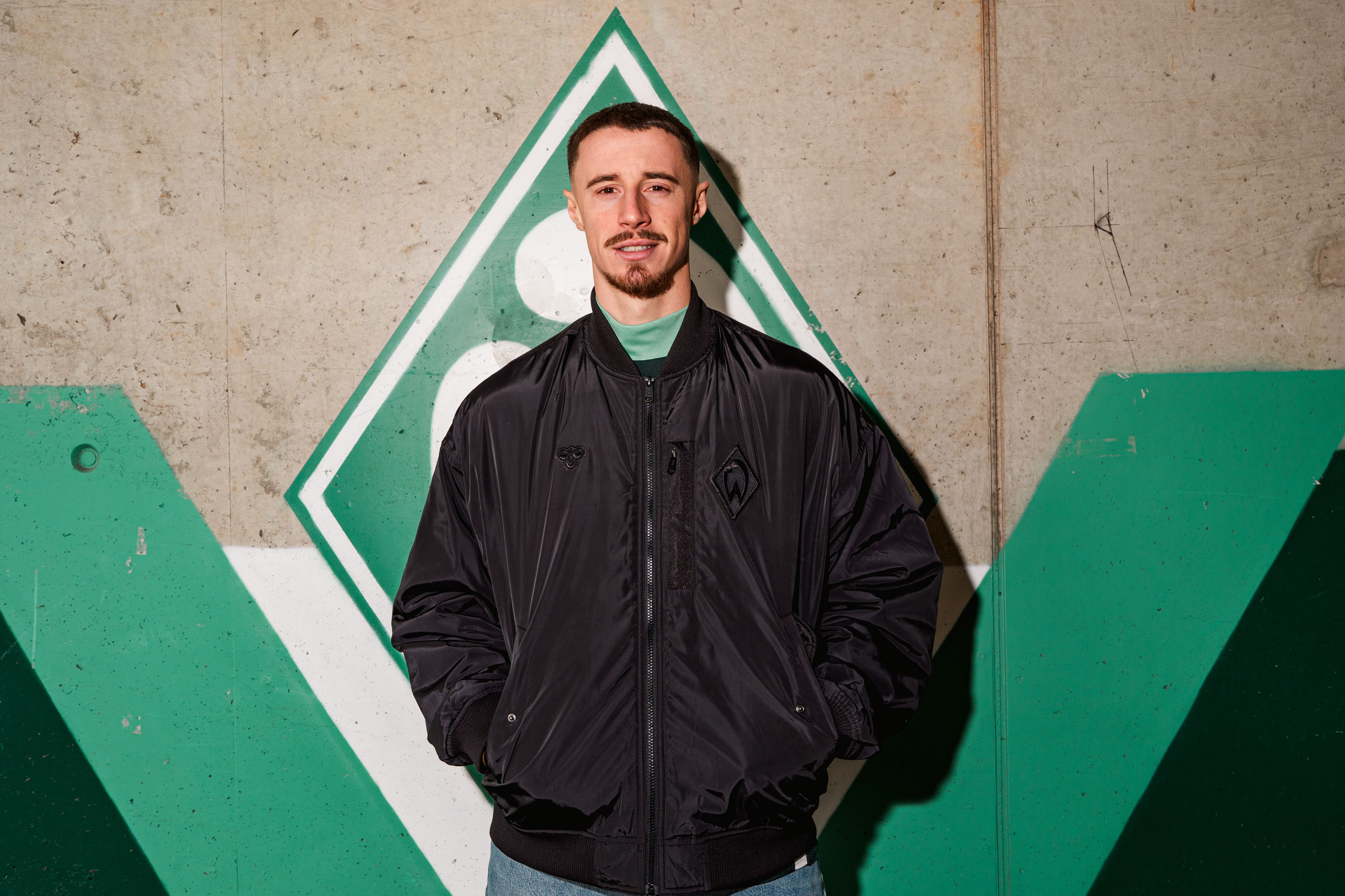 Bild: Marco Friedl in einer Bomberjacke vor einer Wand mit Werder-Raute.