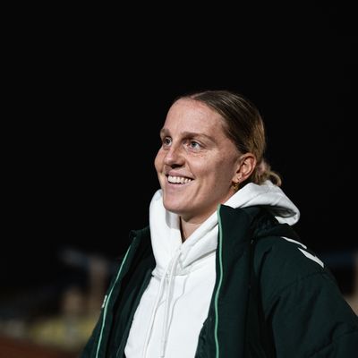 Bild: Fritzy Kromp lächelnd auf dem Trainingsplatz im weißen Oberteil. Im Vordergrund ist unscharf eine Spielerin zu sehen, die Kromp anschaut.