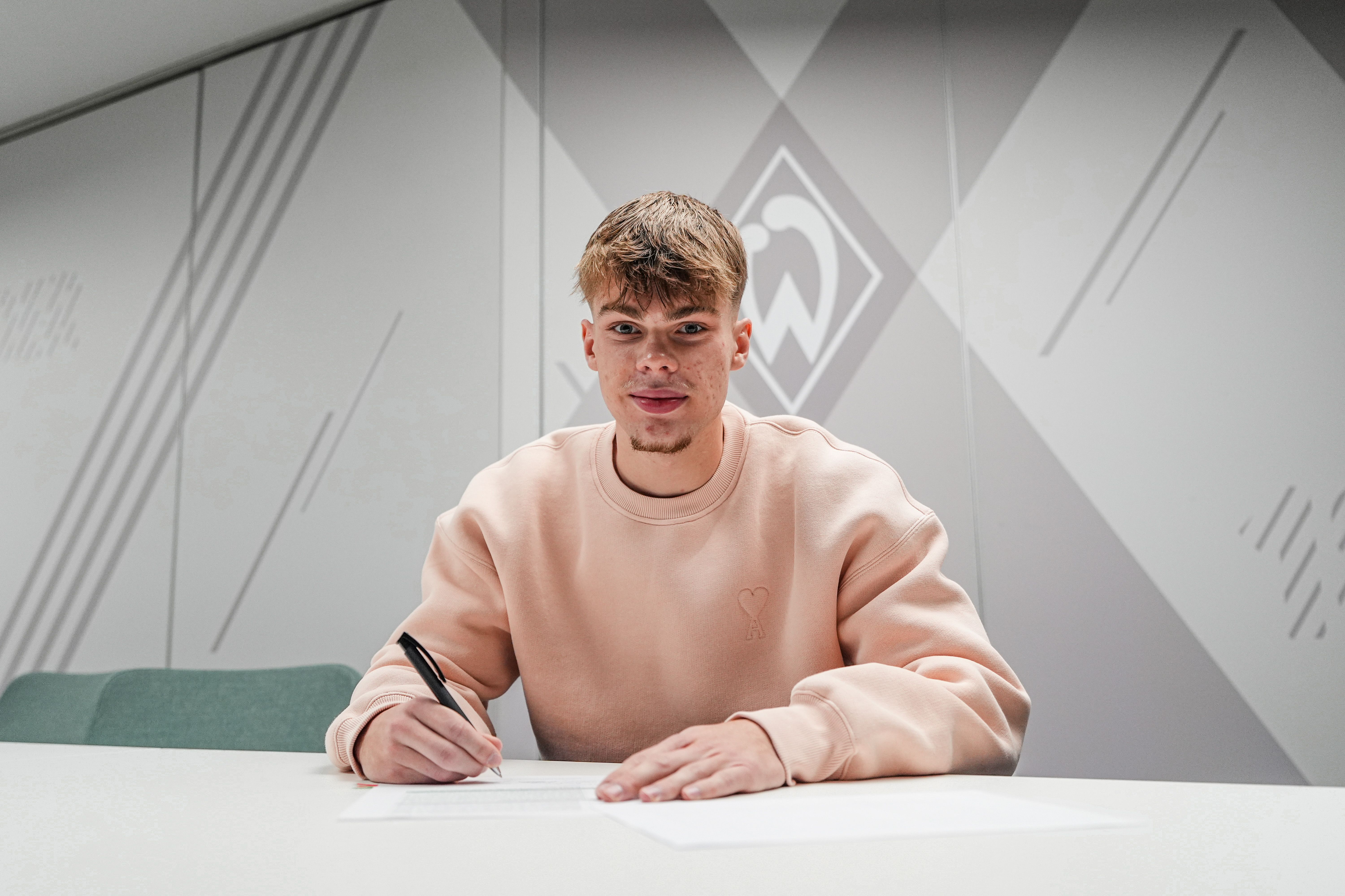 Bild: Mick Schmetgens bei der Vertragsunterschrift vor einer Wand mit der Werder-Raute.