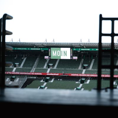 Bild: Leere Stadionplätze mit einer großen digitalen Anzeige, auf der „MOIN“ zu lesen ist, gegenüber dem Aussichtspunkt, eingerahmt von dunklen Geländern.