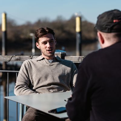 Bild: Olivier Deman sitzt im Interview an einem Tisch, im Hintergrund die Weser.