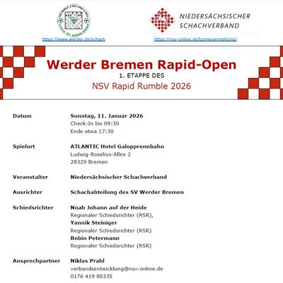 Im Rahmen des Bundesliga-Wochenendes im Januar 2026 veranstaltet die Schachabteilung des SV Werder Bremen in Zusammenarbeit mit dem Niedersächsischen Schachverband (NSV) am Sonntag, den 11.01.2026, das Werder Bremen Rapid Open. Dabei handelt es sich um die 1. Etappe der Turnierserie „NSV Rapid Rumble 2026“.