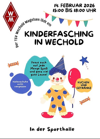 Der TSV Wechold-Magelsen feiert am 14.02.2026 in der Zeit von 15:00 bis 18:00 Uhr Kinderfasching in der Turnhalle in Wechold (Schul- u. Sportgelände) mit Spiel, Spaß und Überraschungen. Natürlich gibt es auch Kuchen und Getränke und vieles mehr. Bitte Hallenschuhe nicht vergessen.