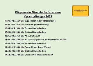 Der "Dörpsverein Eitzendorf e.V." hat eine Übersicht seiner zahlreichen Termine für das Jahr 2025 zusammengestellt.